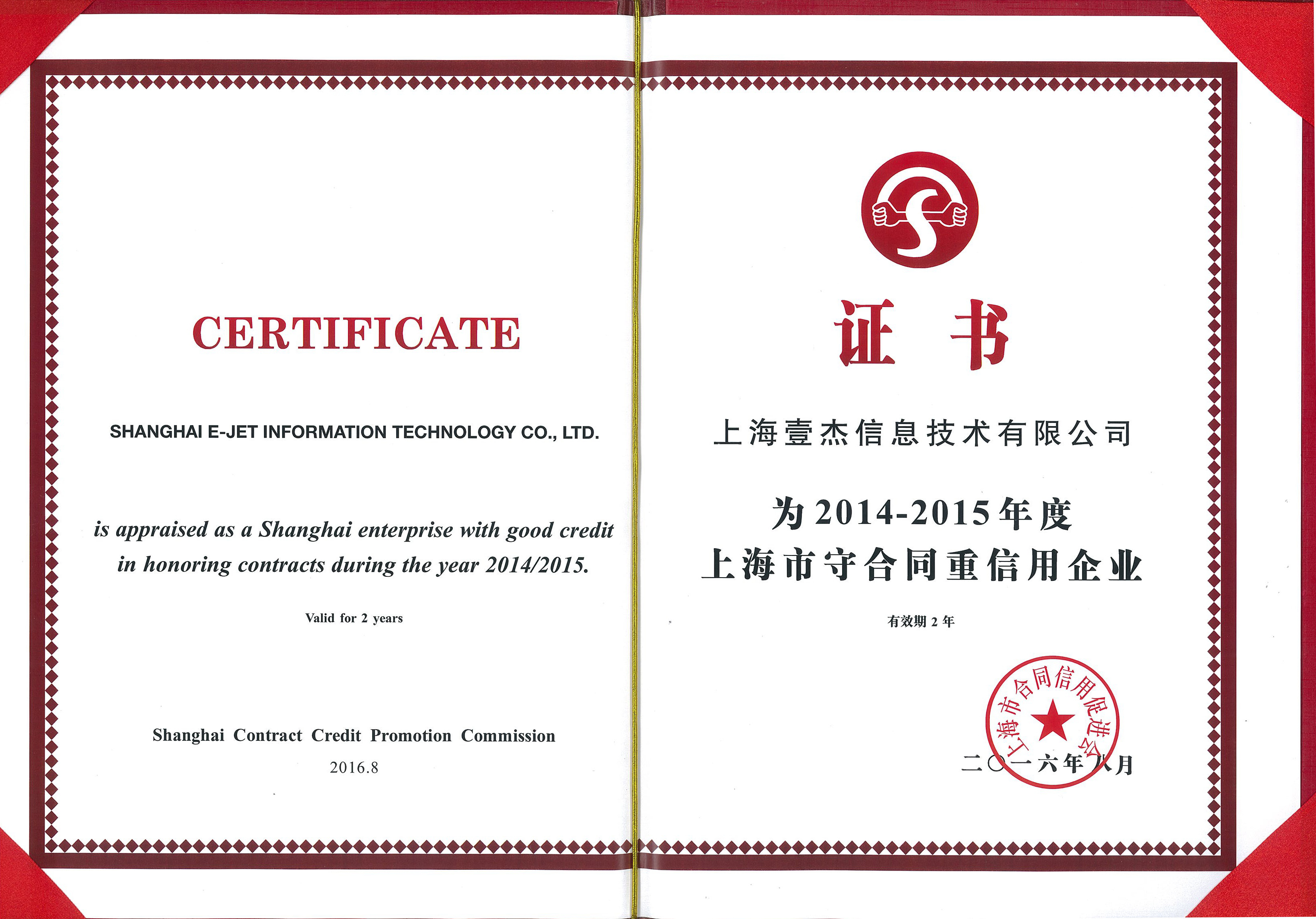 日前,我公司憑借良好的信譽(yù)榮獲上海市合同信用促進(jìn)會(huì)頒發(fā)的“2014-2015年度守合同重信用”證書,合同信用等級(jí)評(píng)定為AAA級(jí)。